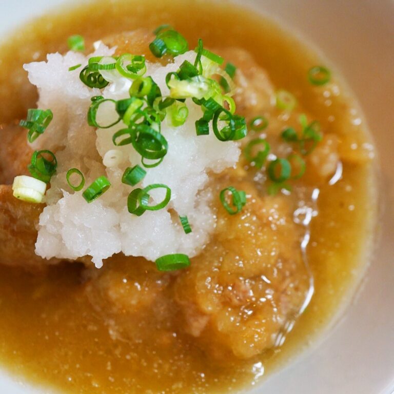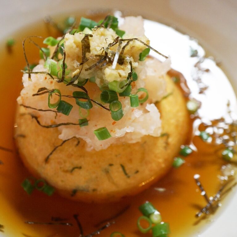 ダメ押しは定番!自家製がんもは揚げだしで!まずはなにより揚げたてあつあつのがんものおいしさ!そのままさっくり出汁に揚げだしでいただきます!地味だけれどなにげに人気の一品ですよ!(お)
