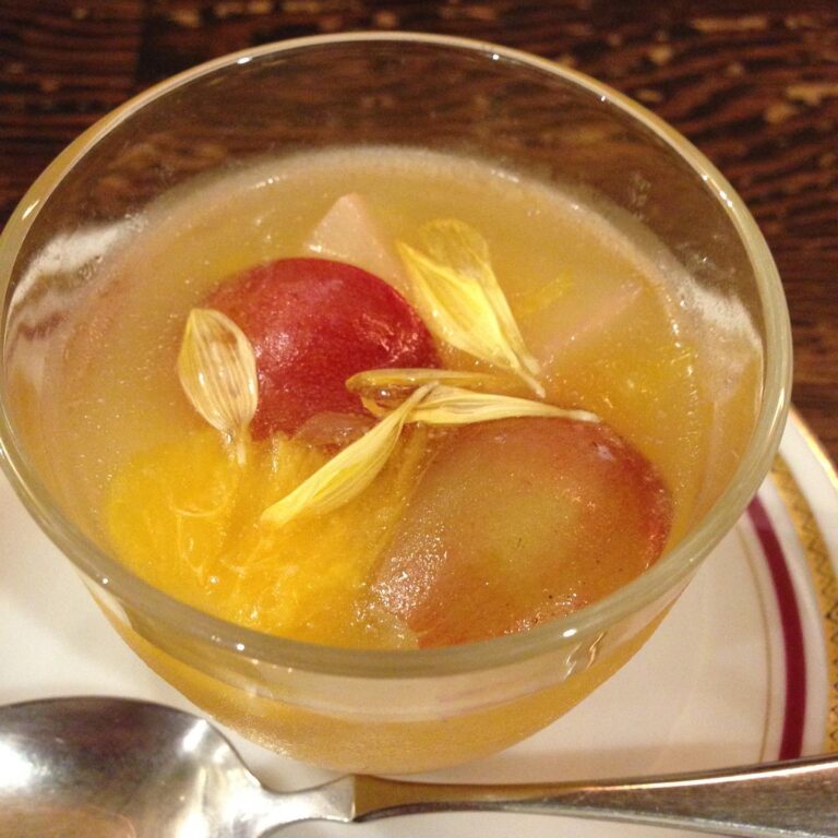 さてと金曜日!めずらしく?店長ミヤザキ謹製デザート!「秋のフルーツゼリー」ぶどうと梨のコンポートにネーブル!ちらりと菊の花を飾りに散らして限定9食!早い者勝ち!(お)