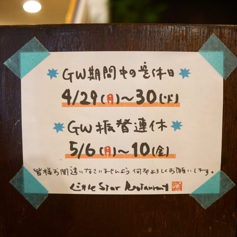 はじまったばかりはGW!当店期間中は通常通り月火で定休日、最終日は振替休日の6日月曜から10日金曜までちらりとGW振替連休をいただきます〜!よろしくねー!(お)