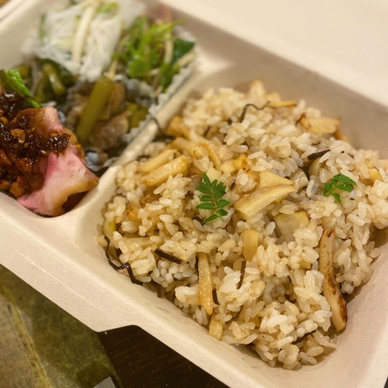その手があったか…! スタッフなおみさんリクエストによる、タケノコチャーハンちょこもり! チャーハン1人前に前菜ちょこちょこ盛り合わせて、つまみにもなる、ごはんにもなるちょこもり、できました。 これはワタシも持ち帰りたい!(麻)