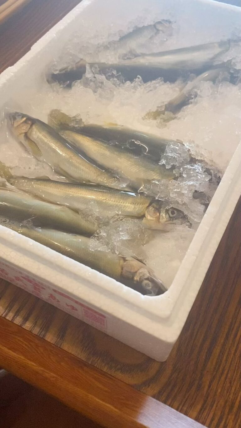 今日の夜からお出ししますよ、稚鮎とごぼうの和風コンフィ! 豊洲から届きました稚鮎、ピッカピカ…ついでに今年からスタッフになってくれております佐々木さんをチラリと映してみる 笑(麻)