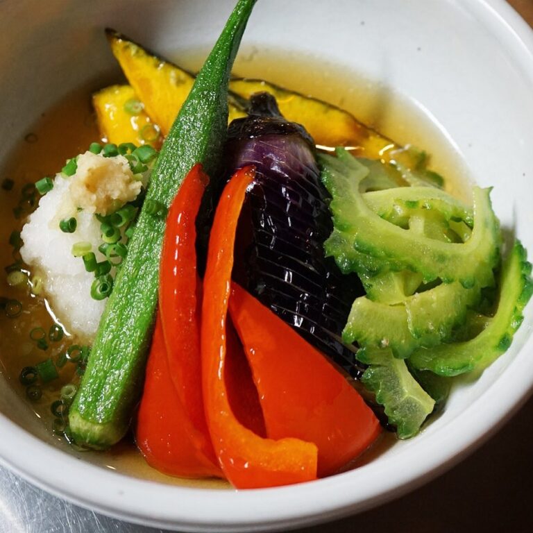 さらに夏バテにはやさしいお味で野菜をさくさくたべるのがよいとおススメ「夏野菜の揚げだし」!茄子にかぼちゃ、ゴーヤにオクラ、パプリカとさっくり素揚げにした夏野菜をそのままだし汁に揚げびたし!こりゃいくらでもたべられそうよ!いや、マジで!(笑)(お)