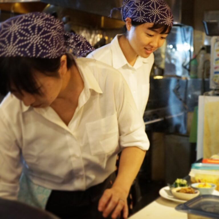 店長ミヤザキ、小さなお惣菜は3品盛りの盛り付けをじっと見て学ぶ新人キッチンスタッフのぐら…(お)
