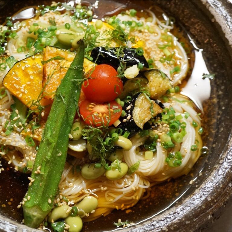 さらに今日は七夕!ということで今週末のとっておきは恒例の「揚げ野菜のっけそうめん」!ひんやりそうめんはやさしいお出汁のめんつゆぶっかけ!さくっと素揚げの夏野菜に薬味をいっしょにつるつるたべよう!今夜ぜひ!(お)