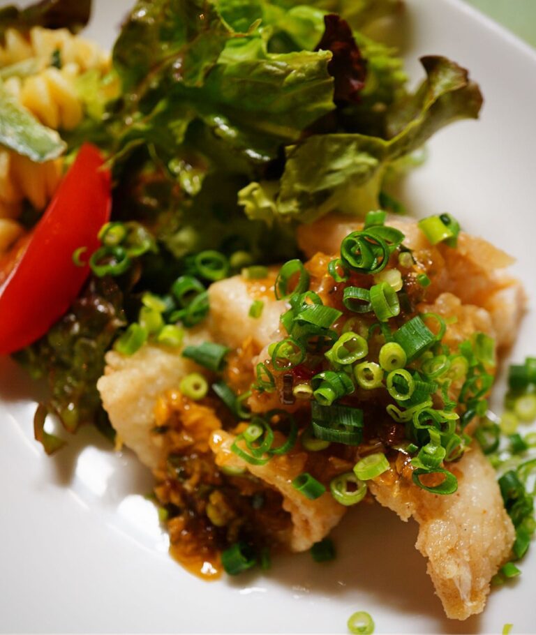 さらに特報!?中華香味だれ好きのみなさん!おなじみ鶏のから揚げに豚のから揚げもおいしいけれど、知っているか?2006年ランチに最後に出たきり音信不通は「たらのから揚げ・中華香味だれ」!昨夜登場は今夜もメニューイン!ぜひ!(お)