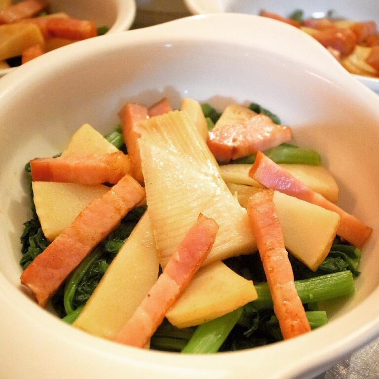 今週はベーコンを加えてますますパワーアップは春のグラタン!「たけのこと菜の花、ベーコンのグラタン」!いや、中身(具)はこんなかんじで春のトリコロール!(笑)まろやかな旨味の自家製ホワイトソースをたっぷり入れたら、チーズをのせてこんがり焼き上げます!ぜひ!(お)