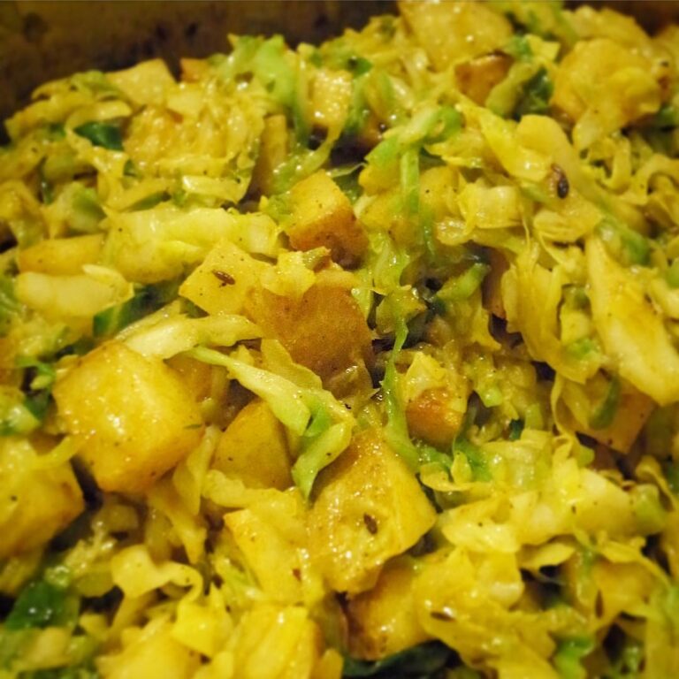 店長ミヤザキ、午後からざっくざっく作ってたのは「新じゃがとキャベツのサブジ」!スパイスでインド風の小さなメニュー!…今夜はお通しに登場ですよ!(お)