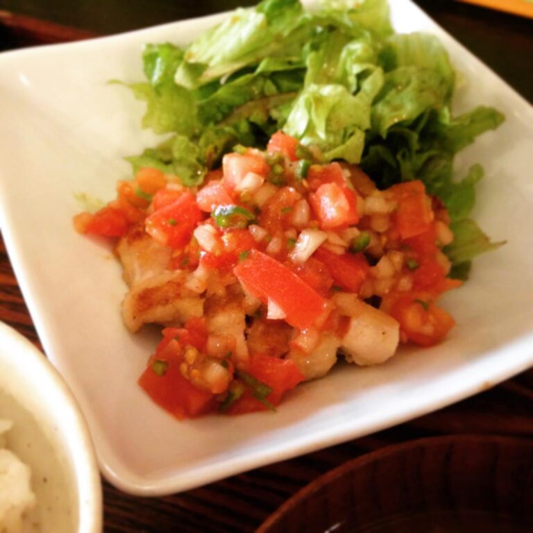 サルサソースのトマト、水々しくて体の乾きが癒された気がします。そして鶏肉だから太りにくいに違いない!「チキンソテー・和風サルサソース定食」、お味噌汁、お米、ひじきの小鉢、なんだかホッとしました。(うめ)