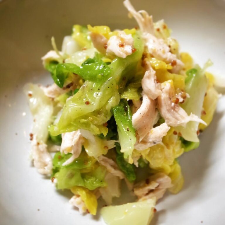 あー、どんより寒い週末ですねと、いや、そんな日もサラダは春でまいりましょう!と「春キャベツと蒸し鶏のサラダ」!店長ミヤザキのフェイバリット!つぶマスタードドレッシングがイイネ!(お)