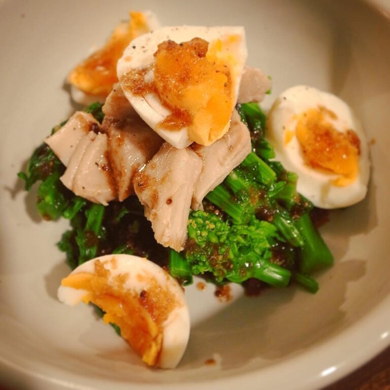 ほんのり寒さも緩んで水曜日、今夜はちょっぴり春のサラダがいいですね!と「菜の花と半熟たまご、自家製ツナのサラダ」がイイネ!春のほろ苦菜の花と、半熟たまごのやさしく濃厚なおいしさ、自家製ツナはしっかり魚の旨味!バルサミコドレッシングでどうそ!(お)