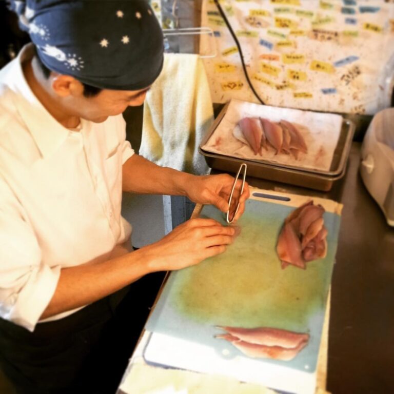 あー、キッチンスタッフのナベさんが、明日のランチ用にアジの小骨をちくちく取っております…いや、地味〜な仕事ですけど、すごく大事な…満足度に直結するよな仕事でもあるねと、えぇ、しっかりたのみますね!(お)