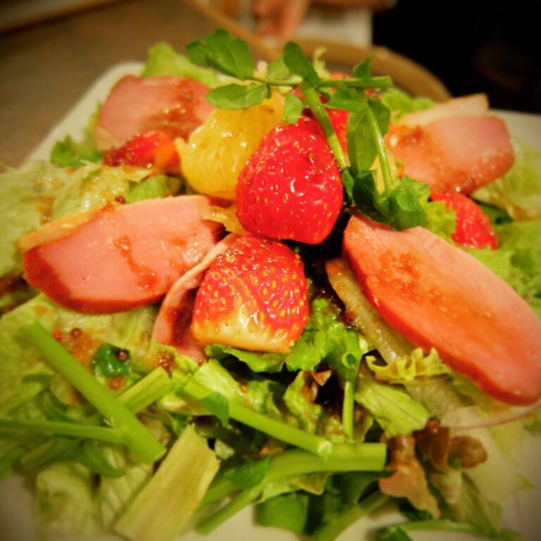 それにしても暖冬ですねとお隣はフルーツの一富士さんの店頭にはすっかりいちごが登場です!と、フレッシュな甘夏も合わせて、合鴨スモークの風味と旨味、緑の野菜のさらたですよ!(お)