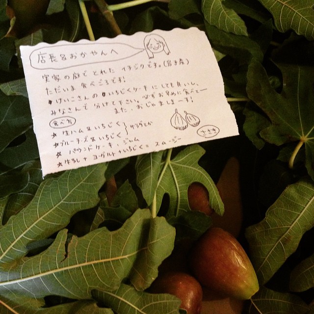 元ホールスタッフのササキ(ささぽん)から、実家のお庭で取れたという、イチジクが届きました!素敵〜。ありがとう!いただきます!(麻)