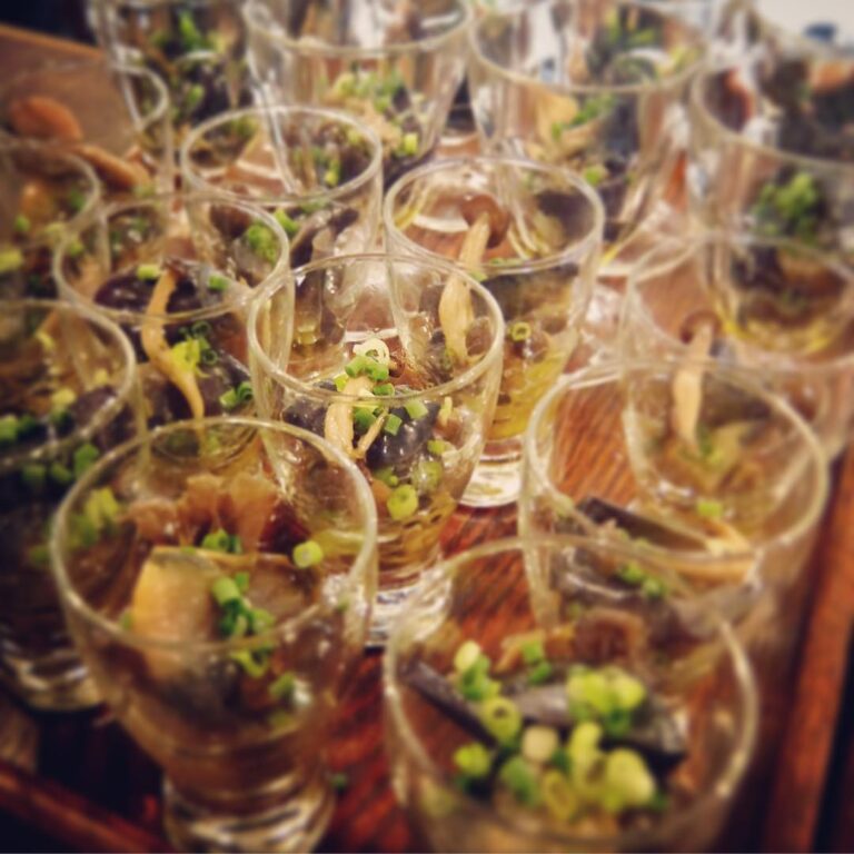 キッチンスタッフのナベさん、店長ミヤザキの指導のもと、きのこのサラダ用のしめじをフランベ…って中華鍋を煽るのがだんだん楽しくなってきてないかい?(笑)…奥のステンに写真を撮るワタクシがほんのり写ってますな(苦笑)。(お)