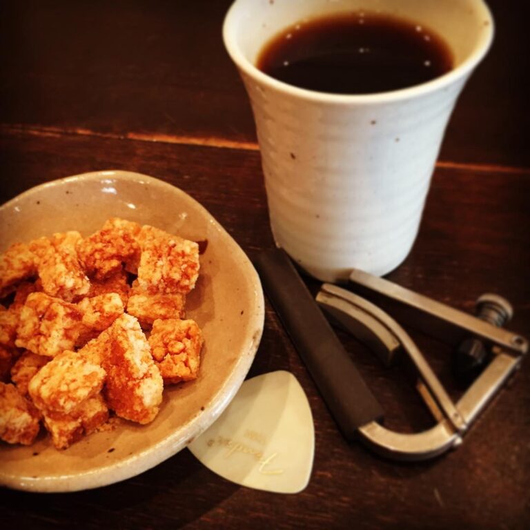 あー、ざざっと雨降りでしたねと、またすっかり晴れたらまほろばブレイク!(笑)今日のお茶請けはかりかりとおかきをいただいております。すこしギターの練習も。(お)