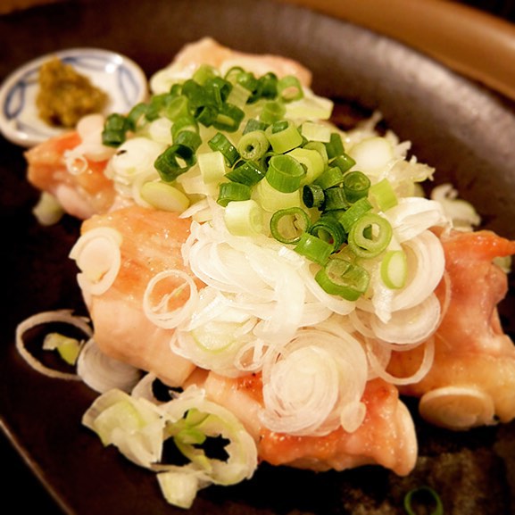 リトスタ風焼き鳥は「ねぎ塩鶏」!じゅうっと焼いたやわらかい旨味いっぱい鶏もも肉はたっぷりねぎといっしょに、柚子こしょうでいただきます!今夜メニューインですよ!(お)