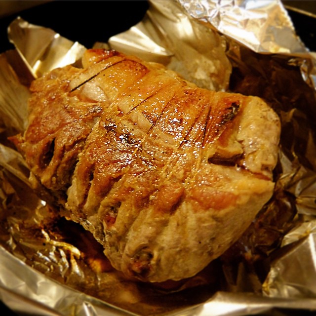 豚肩ロースに糸を巻いて、熱々のフライパンはオリーブオイルとローズマリーでじゅじゅっと焼き色つけたら、あとはじっくり蒸し焼きに!自家製のローストポークは濃厚なナッツバルサミコソースでいただきます!(お)