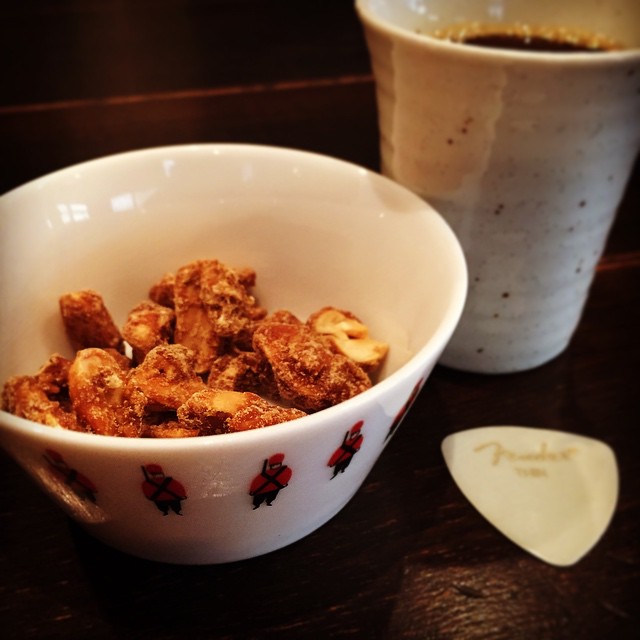 あー、今日は病院に来たついでにまほろばブレイク!(笑)いや、週明け火曜のランチ前にばたばた取りに来てすぐだけれど、えぇ、週末分を考えたらね。ひとしきりギターの練習もして、お茶漬けは黒砂糖をまぶしたピーナツ!器もかわいっスな!(お)