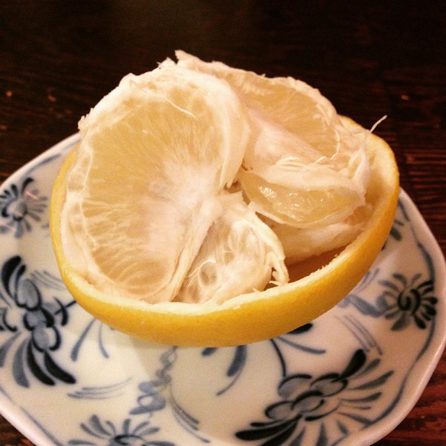 クボさんが田舎・高知の名産ぶんたんをおやつに持ってきてくれました。しかもこんな素敵な盛り付けに。柑橘系を手にした時のクボさんの手さばきはすごいですよ(うめ)