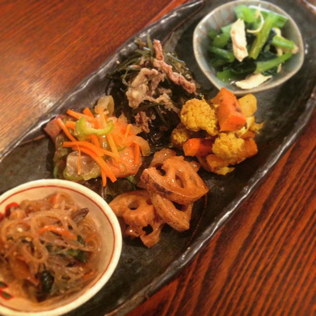 本日のちょこもりランチは、店長の好みが前面に押し出されております。初登場のチャプチェ、素揚げレンコンのマリネ。小松菜と蒸し鶏のからしあえ、カリフラワーと人参のサブジ、牛肉と昆布の炒り煮、鮭の南蛮漬けです。チャプチェ大好きだ!(麻)