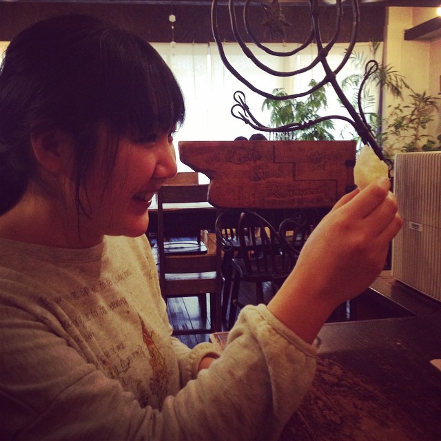 クボ太の季節がやって来ました!故郷の高知から送られて来たという名物、文旦を、ムッキーちゃんでササーッと剥いてくれます。クボ太が一番かっこ良く見える瞬間は、ムッキーちゃんを使ってるとき!とひょうばんです。後ろでは今夜の助っ人、はま子先輩が見守っていますよー(麻)