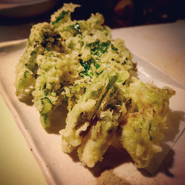 あー、実はココントコ連日人気で売切御礼なのがこちら!「山菜の天ぷら盛りあわせ」!たらの芽、菜の花、ふきのとう!山菜三種をからりと揚げたら、あつあつを抹茶塩で!日本酒にもビールにもうってつけですなあ!(笑)(お)