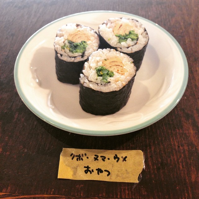 白いごはんが売り切れて、ナベさんのごはんがない!と、思いきや、恵方巻きの売れ残りが出ましたよ。やったね!というわけで、ナベさんの丸かぶり寿司。コジコに花を添えて頂きました。やっぱり男だけじゃ絵にならんからね!(麻)