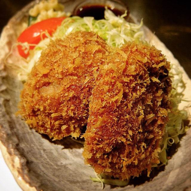 そしてこんなあったかな火曜日の夜!ひえひえビールのおともは「特製メンチカツ」でキマリ!コロモはあくまでサクサク!中から肉汁がじゅわっとジューシー!ソースをだぼだぼつけていただきます!(お)