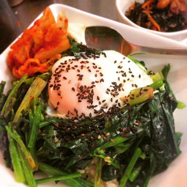 今日はランチが忙しく、オカズが足りません…ということで、店長ミヤザキは、ヘルシーにほうれん草丼を作りました。黒ゴマもかけて、いただいちゃいまーす(麻)