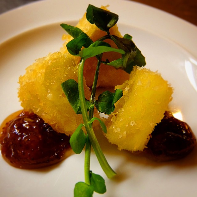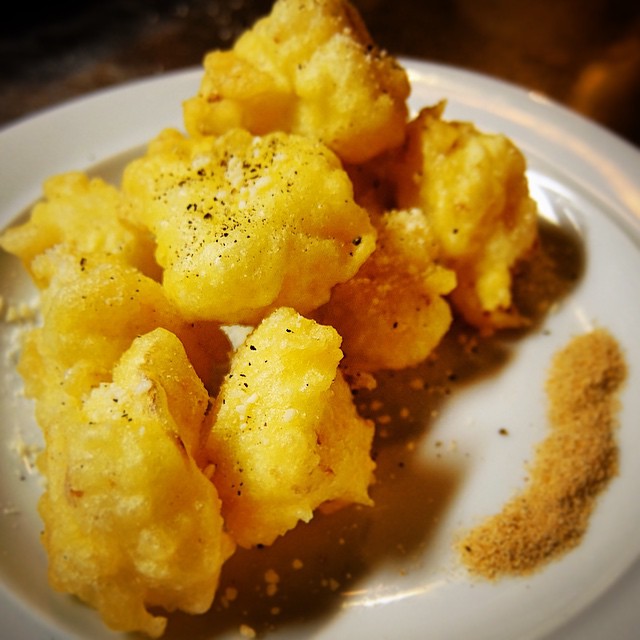 さてさて、もひとつワインによく合うおつまみと言えば「カリフラワーのチーズフリット」!今が旬!ぷりぷりカリフラワーをそのままチーズ風味の天ぷらに!(笑)いや、カリフラワーのこと、見直すこと間違いなしのあつあつメニュー!カレー塩でどうぞ!(お)