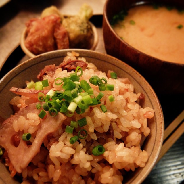 ところで、貸し切りやコース宴会などでは、普段なかなかお出しできないごはんものも登場したりしますよ!(いつもではないですが)先日の貸し切りでは「牛肉とれんこんの炊き込みごはん」秋らしいおいしさいっぱい!ワタクシも残りものを小さく御膳でいただきました、ありがとうございました。(お)