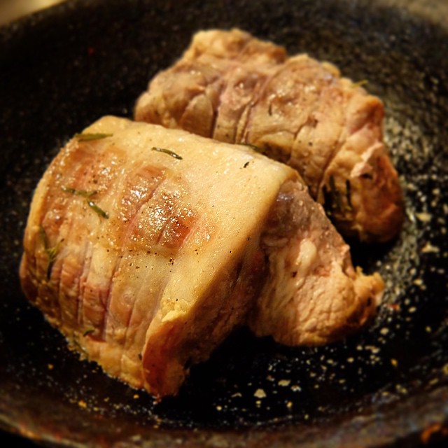 あー、本日のおススメ、もちろんワインによく合う一品は「ローストポーク」!…じゅうっと焼かれているトコロであります!いや、実においしそう!(笑)(お)