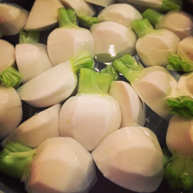 キュッとむかれたかぶ、水にさらされておるのであります。おいしい煮物になるのであります、ハイ(お)。