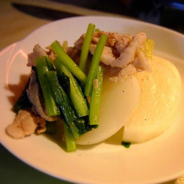 そしてさっき見事に自立してたかぶ!本日はやさしいお味の「かぶと豚バラ肉の蒸し煮」でお出しします!かぶそのもののおいしさ…ワタクシの荒んだココロ(?)も、やさしくとけていくわけでありますね!(たぶん)(笑)(お)