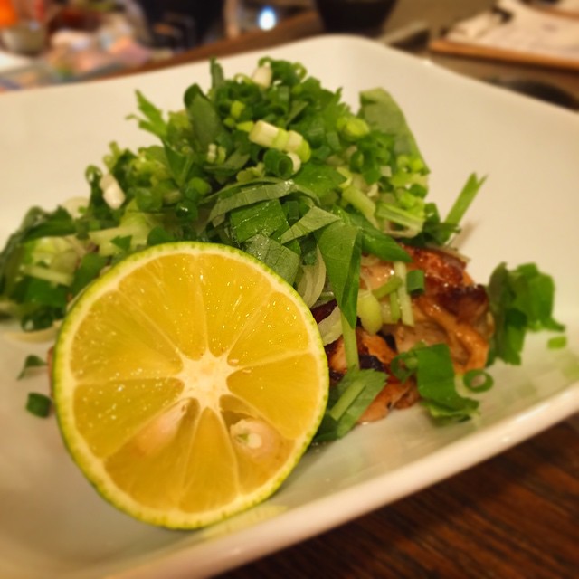 さてさて、昨夜ののんびりに懲りて(?)、今夜のおススメお料理でも〜!(笑)まずは新メニュー「鶏の山椒蒸し」!山椒の実とごま油の風味、ざっくり酒蒸しにしたやわらかい鶏肉のその上に、たっぷりねぎに三ッ葉を散らして!ぽん酢とすだちでさっぱりどうぞ!(お)