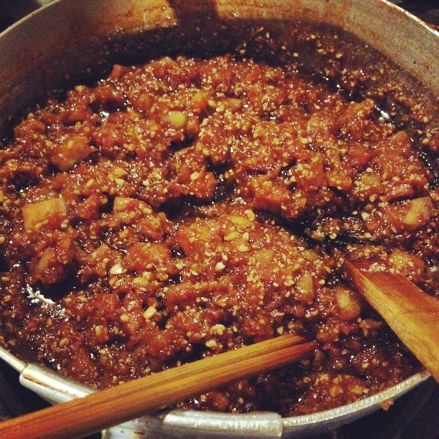 本日の店長ミヤザキ、ヒマに任せて作ってたのはこれ!沖縄風肉味噌!アンダンスー!(…先に小さなおにぎりにしていただきました!おいしかった!…笑)(お)