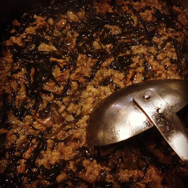ちょこ盛りでおなじみの昆布と牛肉の炒り煮がぐつぐついっておりますな、絵があまりに地味すぎた(苦笑)。(お)
