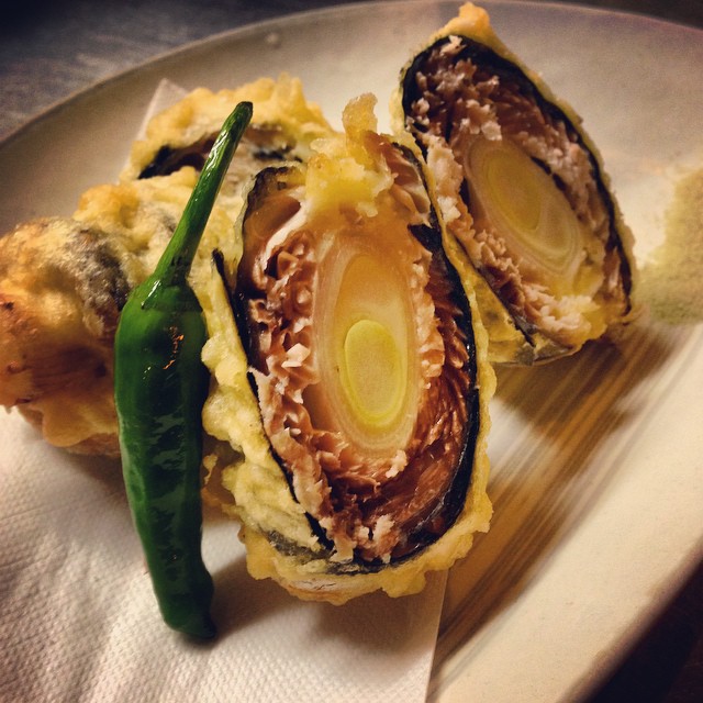 長ねぎに秋刀魚をぐるりと巻いて、からり揚げたてあつあつ天ぷら!その名も「たづな揚げ」!巻きつけて縄状になるので、こんなヘンテコな名前なんだよ!(笑)(お)