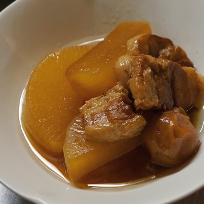 十何年ぶり?に登場させてみました、豚バラ肉と大根の梅酒煮…! 豚バラ肉は生姜と一緒に柔らかくなるまでじっくり煮込み、大根と梅酒を合わせてさらにコトコト…梅酒の香りが爽やかな、酸味と甘みと旨味の合わせ技!できております。 イメージ的には、爽やかになった黒酢煮みたいな味わい。ぜひ試していただきたい一品です♪(麻)