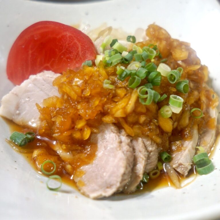 いや当店元祖「たまねぎしょうゆ」と言えば開店当時からずっと人気ですよ「ゆで豚・たまねぎしょうゆ」! 香味野菜といっしょにゆっくりじっくり茹でたゆで豚の旨味、さっと茹でしたみずみずしいもやしの食感、そこにさっぱり自家製たまねぎしょうゆがベストマッチ!さっとお出し出来ますので、ビールといっしょに「とりあえず〜」でよろしくお願いしますね!(笑)(お)