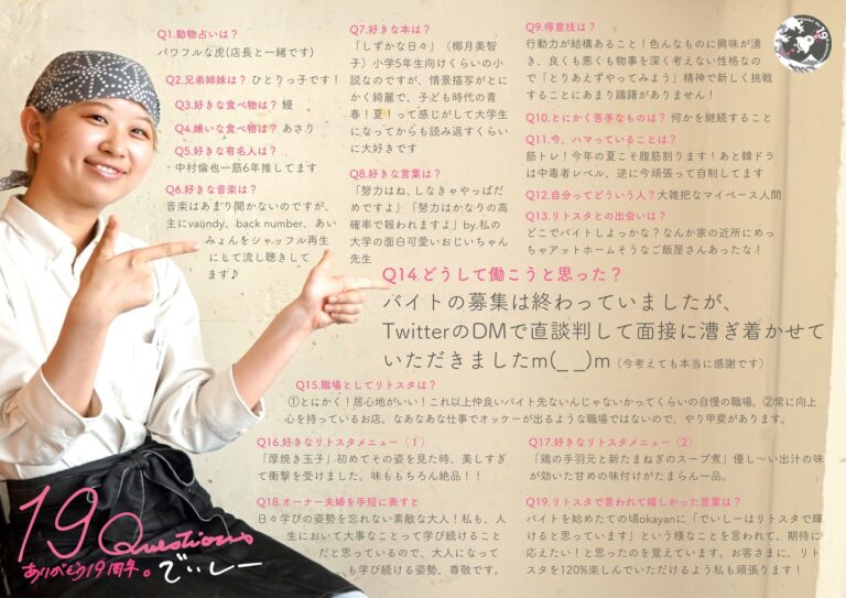 さてさて当店6月は祝!19周年記念ウィークもすっかり1週間…ここからは毎年恒例のスタッフ紹介ポスターは「19Questions」今日から毎日ひとりずつアップしていきますね〜!と、新人さんからベテランへの順番でまいりますよ!まずは去年のちょうど今頃リトスタ入りの大学生スタッフはでいしー! Q1.動物占いは? パワフルな虎(店長と一緒です) Q2.兄弟姉妹は? ひとりっ子です! Q3.好きな食べ物は? 鰻 Q4.嫌いな食べ物は? あさり Q5.好きな有名人は? 中村倫也一筋6年推してます Q6.好きな音楽は? 音楽はあまり聞かないのですが、 主にvaundy、back number、あいみょんをシャッフル再生にして流し聴きしてます♪ Q7.好きな本は? 「しずかな日々」(椰月美智子)小学5年生向けくらいの小 説なのですが、情景描写がとに かく綺麗で、子ども時代の青 春!夏!って感じがして大学生 になってからも読み返すくらい に大好きです Q8.好きな言葉は? 「努力はね、しなきゃやっぱだめですよ」「努力はかなりの高確率で報われますよ」by.私の大学の面白可愛いおじいちゃん 先生 Q9.得意技は? 行動力が結構あること!色んなものに興味が湧き、良くも悪くも物事を深く考えない性格なので「とりあえずやってみよう」精神で新しく挑戦することにあまり躊躇がありません! Q10.とにかく苦手なものは? 何かを継続すること Q11.今、ハマっていることは? 筋トレ!今年の夏こそ腹筋割ります!あと韓ドラは中毒者レベル、逆に今頑張って自制してます Q12.自分ってどういう人? 大雑把なマイペース人間 Q13.リトスタとの出会いは? どこでバイトしよっかな?なんか家の近所にめっちゃアットホームそうなご飯屋さんあったな! Q14.どうして働こうと思った? バイトの募集は終わっていましたが、TwitterのDMで直談判して面接に漕ぎ着かせて いただきましたm(_ _)m(今考えても本当に感謝です) Q15.職場としてリトスタは? 1:とにかく!居心地がいい!これ以上仲良いバイト先ないんじゃないかってくらいの自慢の職場。2:常に向上心を持っているお店。なあなあな仕事でオッケーが出るような職場ではないので、やり甲斐があります。 Q16.好きなリトスタメニュー(1) 「厚焼き玉子」初めてその姿を見た時、美しすぎて衝撃を受けました。味ももちろん絶品!! Q17.好きなリトスタメニュー(2) 「鶏の手羽元と新たまねぎのスープ煮」優し〜い出汁の味が効いた甘めの味付けがたまらん一品。 Q18.オーナー夫婦を手短に表すと 日々学びの姿勢を忘れない素敵な大人!私も、人生において大事なことって学び続けることだと思っているので、大人になっても学び続ける姿勢、尊敬です。 Q19.リトスタで言われて嬉しかった言葉は? バイトを始めたての頃okayanに「でいしーはリトスタで輝けると思っています」という様なことを言われて、期待に応えたい!と思ったのを覚えています。お客さまに、リトスタを120%楽しんでいただけるよう私も頑張ります!
