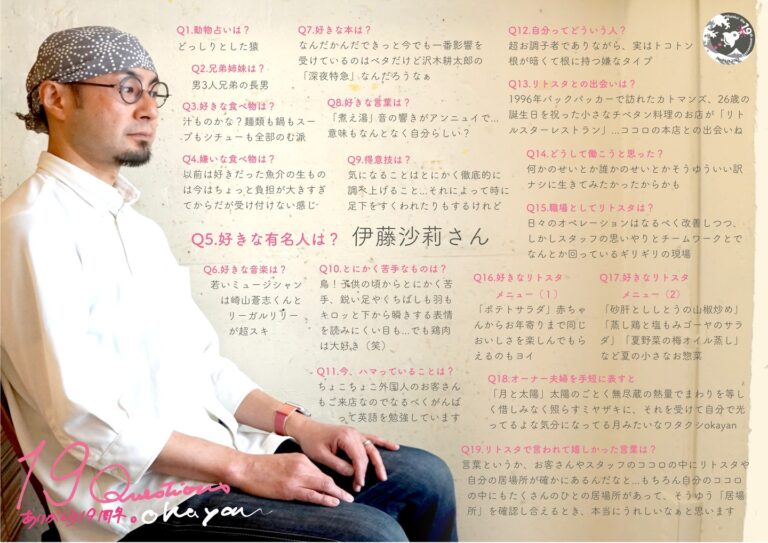 あー、そして2004年開店当時からおりますのが当店オーナー(その2)でもありますワタクシokayan(笑)。いや、こうしてお店なんて長くやっているのもあって?お客さんにはちょっと「いいヒト」なんて思われているのでは?なんてちらりと思っているのですが(それはそれでいいことなんですけど)、実際は臆病で心配性で石橋を叩いて壊して用心深くて損得で、でも迂闊で調子に乗りやすい小さい男でございますとも、えぇ、そのあたり以後お見知り置きを(苦笑)。 Q1.動物占いは? どっしりとした猿 Q2.兄弟姉妹は? 男3人兄弟の長男 Q3.好きな食べ物は? 汁ものかな?麺類も鍋もスープもシチューも全部のむ派 Q4.嫌いな食べ物は? 以前は好きだった魚介の生ものは今はちょっと負担が大きすぎてからだが受け付けない感じ Q5.好きな有名人は? 伊藤沙莉さん Q6.好きな音楽は? 若いミュージシャンは崎山蒼志くんとリーガルリリーが超スキ Q7.好きな本は? なんだかんだできっと今でも一番影響を受けているのはベタだけど沢木耕太郎の「深夜特急」なんだろうなぁ Q8.好きな言葉は? 「煮え湯」音の響きがアンニュイで… 意味もなんとなく自分らしい? Q9.得意技は? 気になることはとにかく徹底的に 調べ上げること…それによって時に足下をすくわれたりもするけれど Q10.とにかく苦手なものは? 鳥!子供の頃からとにかく苦手、鋭い足やくちばしも羽もキロッと下から瞬きする表情を読みにくい目も…でも鶏肉は大好き(笑) Q11.今、ハマっていることは? ちょこちょこ外国人のお客さんもご来店なのでなるべくがんばって英語を勉強しています Q12.自分ってどういう人? 超お調子者でありながら、実はトコトン根が暗くて根に持つ嫌なタイプ Q13.リトスタとの出会いは? 1996年バックパッカーで訪れたカトマンズ、26歳の誕生日を祝った小さなチベタン料理のお店が「リトルスターレストラン」…ココロの本店との出会いね Q14.どうして働こうと思った? 何かのせいとか誰かのせいとかそうゆういい訳ナシに生きてみたかったからかも Q15.職場としてリトスタは? 日々のオペレーションはなるべく改善しつつ、しかしスタッフの思いやりとチームワークとでなんとか回っているギリギリの現場 Q16.好きなリトスタメニュー(1) 「ポテトサラダ」赤ちゃんからお年寄りまで同じおいしさを楽しんでもらえるのもヨイ Q17.好きなリトスタメニュー(2) 「砂肝とししとうの山椒炒め」「蒸し鶏と塩もみゴーヤのサラダ」「夏野菜の梅オイル蒸し」など夏の小さなお惣菜 Q18.オーナー夫婦を手短に表すと 「月と太陽」太陽のごとく無尽蔵の熱量でまわりを等しく惜しみなく照らすミヤザキに、それを受けて自分で光ってるよな気分になってる月みたいなワタクシokayan Q19.リトスタで言われて嬉しかった言葉は? 言葉というか、お客さんやスタッフのココロの中にリトスタや自分の居場所が確かにあるんだなと…もちろん自分のココロ の中にもたくさんのひとの居場所があって、そうゆう「居場所」を確認し合えるとき、本当にうれしいなぁと思います