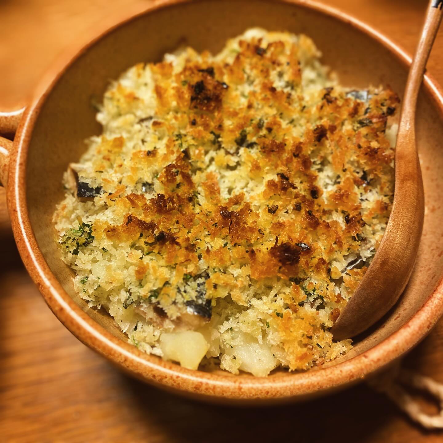 本日はそんなリトスタの残り物ちょこもりで一献。ボジョレちょこもりで作ったグラタン用のマッシュポテトに余ったさんまのコンフィをのせて香草パン粉焼きに。