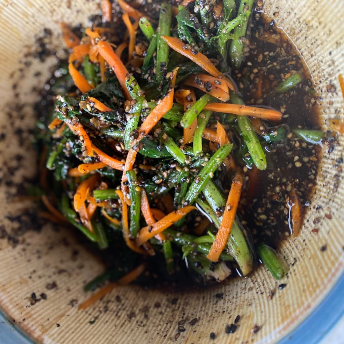 中華を食べすぎて、和食寄りの手のかかったもの食べたくなったぞ…とりあえず冷蔵庫の整理を兼ねてちゃちゃっと2品。胡瓜としめじと豚しゃぶの梅和え。にんじんとほうれん草の黒胡麻和え。