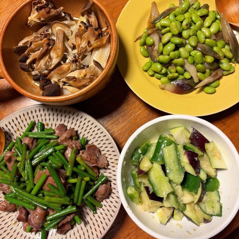 昨日は調子に乗って、コロナ後初のカラオケに行ってしまった夜更かししてよく飲んだので、今日の晩酌は野菜寄り。 きのこと蓮根のロースト、枝豆と茗荷の炒め物、胡瓜と水茄子の冷菜、砂肝とにんにくの芽の炒め物。 茗荷と枝豆炒めのお皿は、誕生日にぬまっち・ウメさん・いのっちからもらった関口憲孝さんのもの。思った以上に可愛く盛れました。