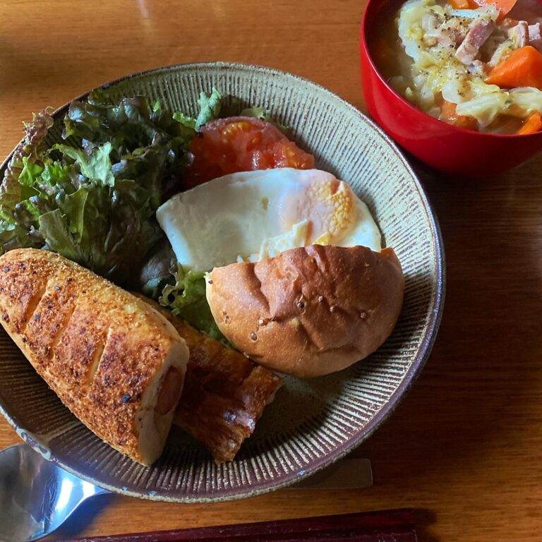 旅行は楽しいけど疲れるなぁ食い倒れ旅で野菜不足…キャベツ山盛りコンソメスープを作って、横浜から持ち帰ったウチキパンの惣菜パンでお昼ごはん。こういう何気ないフツーのお惣菜パンも大好き。
