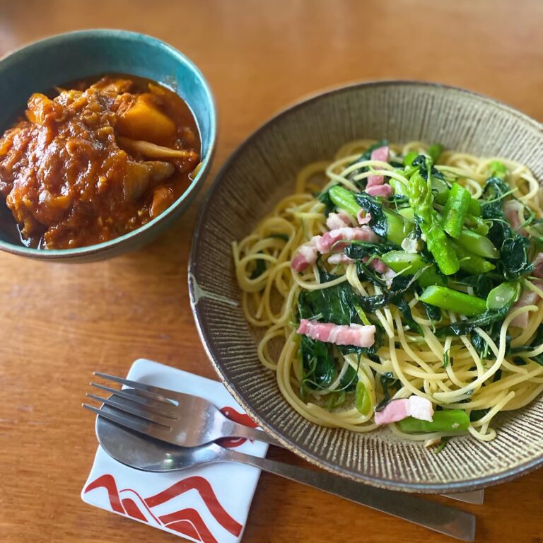 昨日の夜はレイトショー、三谷幸喜の「おい、太宰」を観に立川へ。レイトショーだからとその前に飲みに行って…映画中、眠気が来てウトウトしてしまい映画が十分楽しめなかった 今日はワタシが作る、葉唐辛子とアスパラ、パンチェッタのペペロンチーノ。葉唐辛子を見つけるとついつい買ってしまう。大量の青唐辛子のおまけ付き。アスパラは広島から来たふうじいさんのお土産、ニンニクは元スタッフにっしーのお父さんが愛媛で作ったもののお裾分け。ありがたいいただきものが続きます。 トマト煮はokayan作、トマト野菜ジュースから美味しく作るのが手慣れてきたなー。