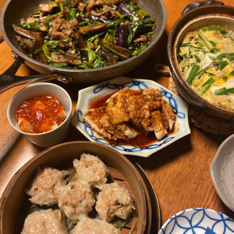 周年記念が近いので、ポスターのためのコピーワークなどしていたら遅い時間に でも昼間に適当シューマイ仕込んでおいたぜ偉いぞ私。お店の残りの香味どり四川ソース、イカの台湾風、ニラ玉、茄子とアスパラとほうれん草の豆豉炒め。 これから6月1日に向けて縁の下の仕事が続くぜ。