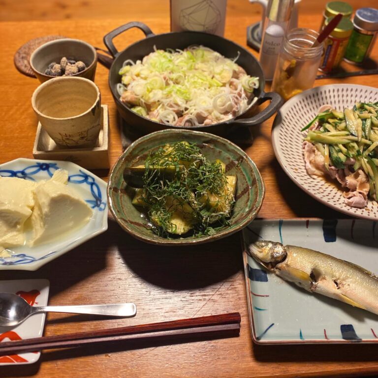 はあー、なかなか終わらないお仕事、ともかく遅い時間になったのでごはんだ、晩酌だ! お店でも出している、ねぎ塩鶏。豚しゃぶときゅうりの辛子味噌だれ。水茄子の浅漬けサラダ。とうもろこし豆腐、来週から出す予定の鮎の和風コンフィの味見。スタッフさかっちがokayanの誕生日にくれた総本家天狗納豆。これまたokayanの誕生日にクロコとぬまっちがプレゼントしてくれた日本酒、山口の天美をあわせますよー!