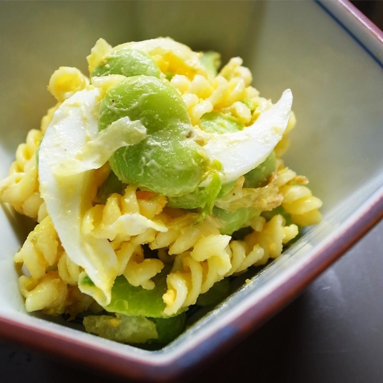 single 本日夜からの新メニュー、そら豆とセロリのマカロニサラダです。いつものランチに添えているマカロニサラダより少し大人の、おつまみサラダ。ビール持って来てー!(麻)